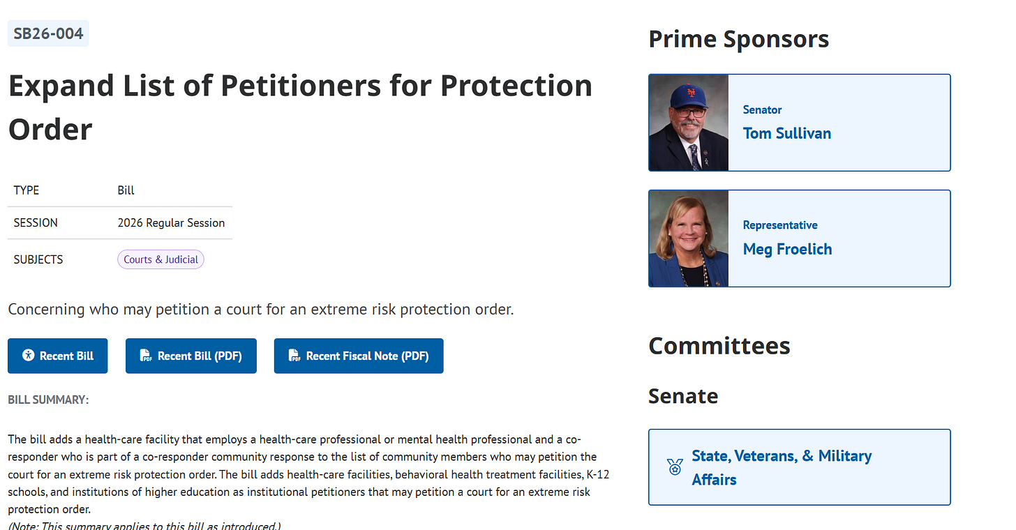 SB26-004 was the first of Senators Sullivan's and Froelich's crop of gun control bills for 2026. The bill itself is linked first below.