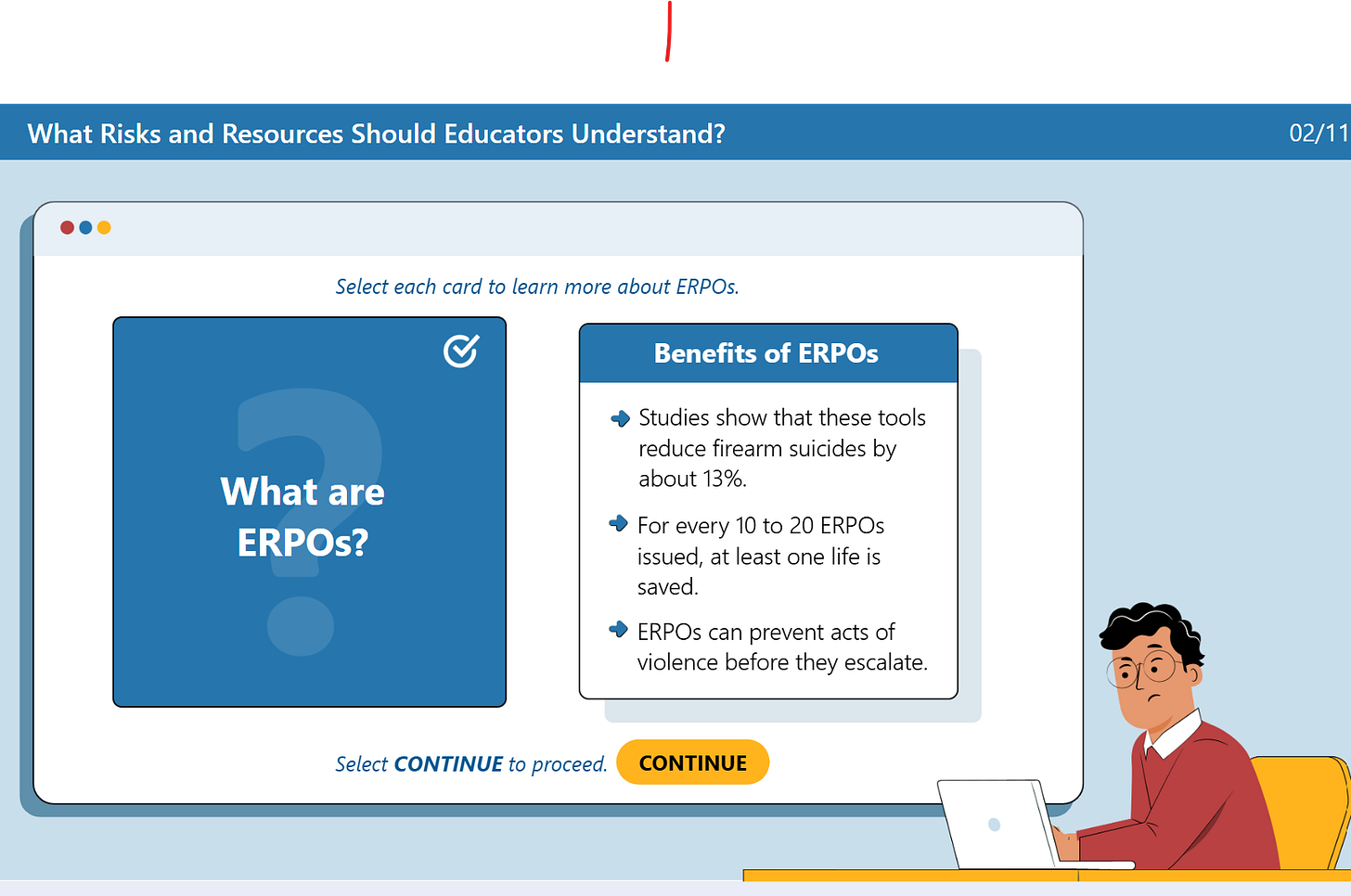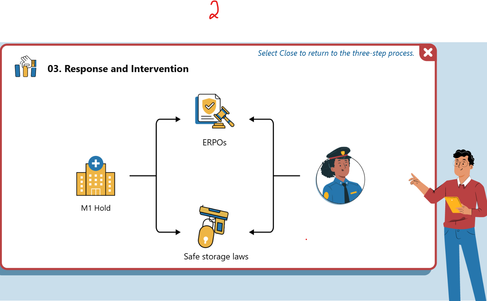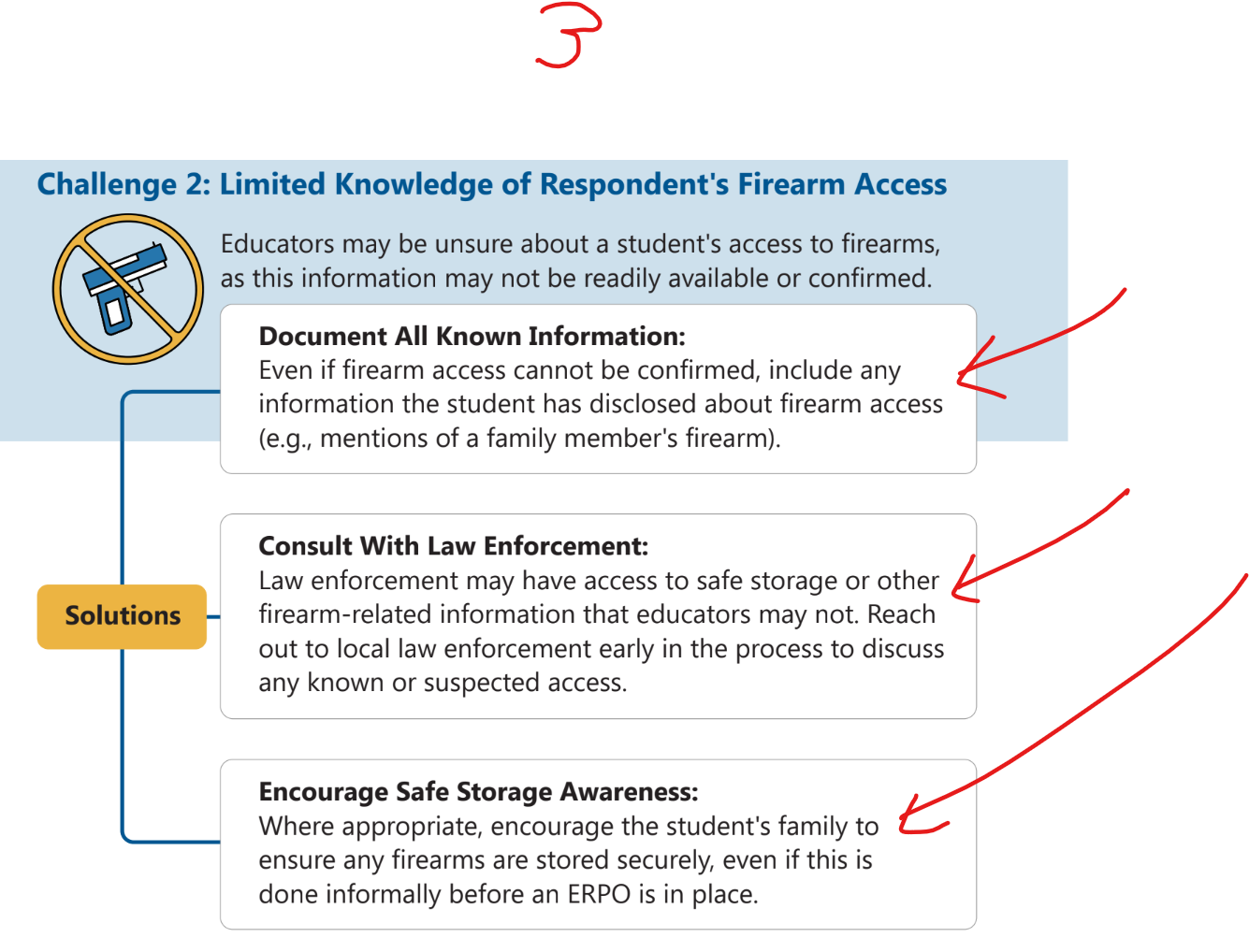 Screenshot 2 shows something repeatedly referenced in the training: one way or another, it was mentioned that for students not legally old enough to own firearms, an ERPO and/or the police could be used to enforce (I also heard reinforce) safe storage laws.