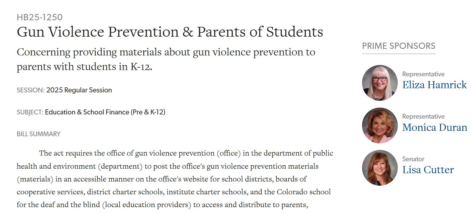 A bill passed into law in the regular legislative session this year required, quoting the bill’s fiscal note from the first link below “The bill requires the Office of Gun Violence Prevention in the Department of Public Health andEnvironment (CDPHE) to post or link to certain materials on its website for local educationproviders, including school districts, boards of cooperative services, district charter schools,institute charter schools, approved facility schools, and the Colorado School for the Deaf and theBlind.”