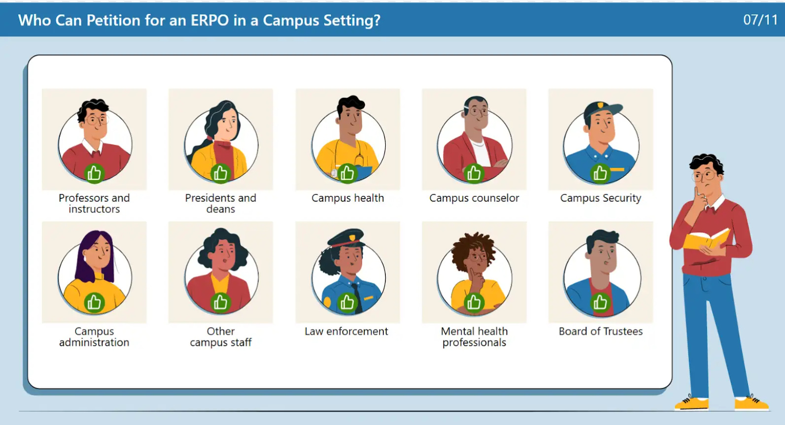 The first is the image you see heading this post. This is the list of education workers that can now file an ERPO. I wish I could tell you who all fit in the “other campus staff” category, but they didn’t delve into that. This seems to almost indicate that the janitor could pull an ERPO on a student if they saw fit.