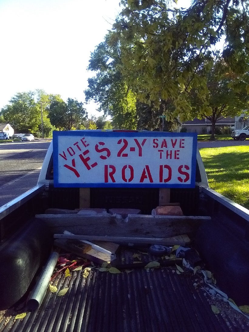 I saw the homemade sign you see in the picture above a couple, three times as I’ve driven around town. It’s urging a YES vote on Sterling’s 2-Y tax, the one supposed to fix Sterling’s roads.