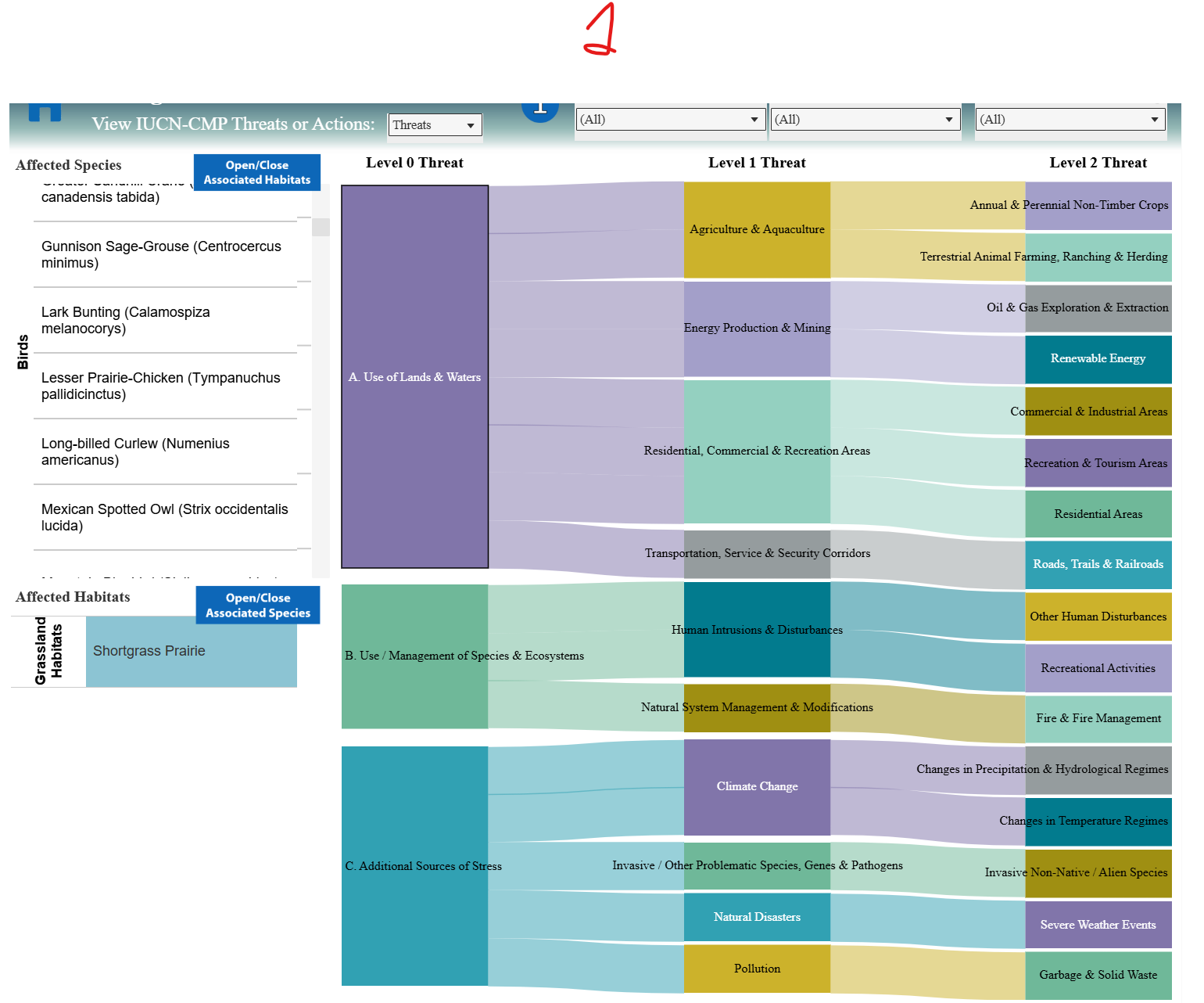 Following the link titled “Explore Threats to Species and Habitats”, I selected shortgrass prairie and took screenshots.