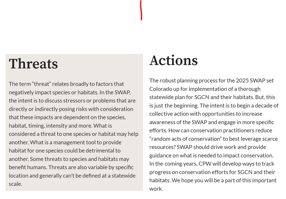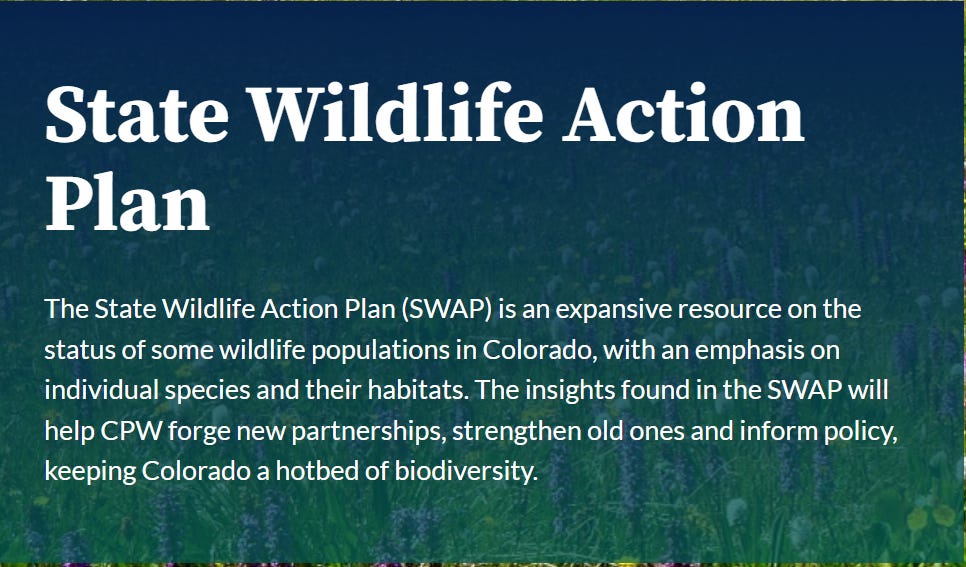 I wanted to follow up with a look at CPW’s own similar report. Linked first below is CPW’s State Wildlife Action Plan.