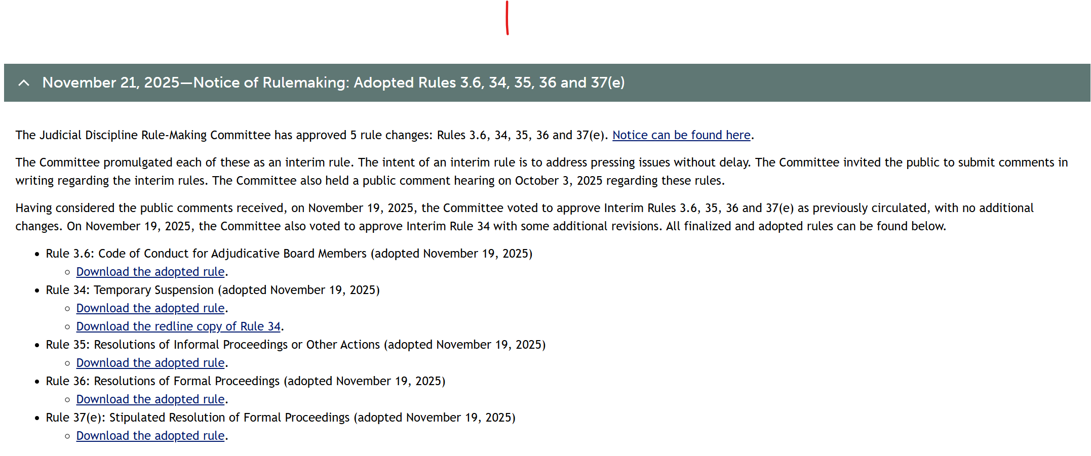 Finished rules on judicial discipline (along with the published public comment) are available.