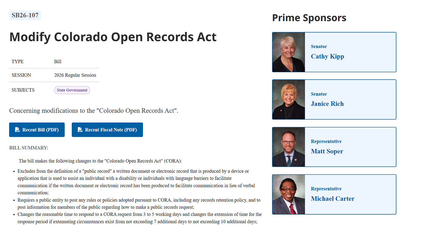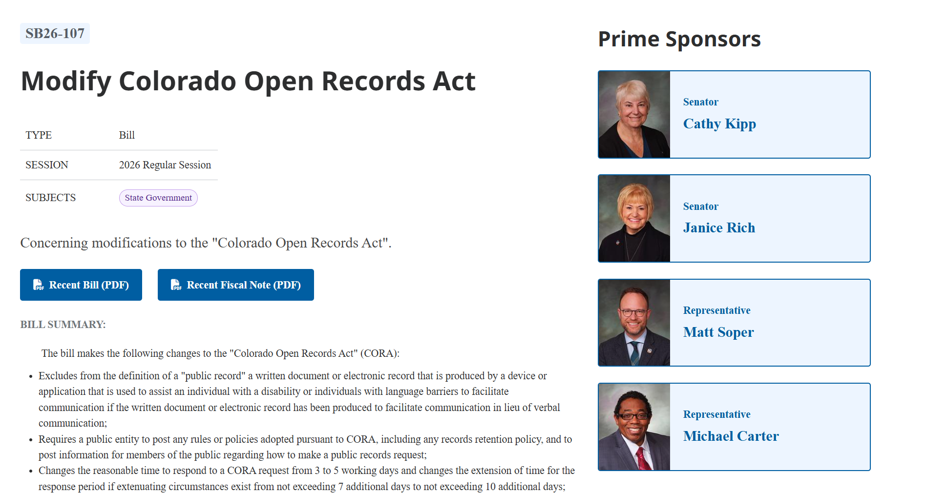 I wrote in the past about Senator Kipp’s 2026 stab at the Colorado Open Records Act (CORA) law.
