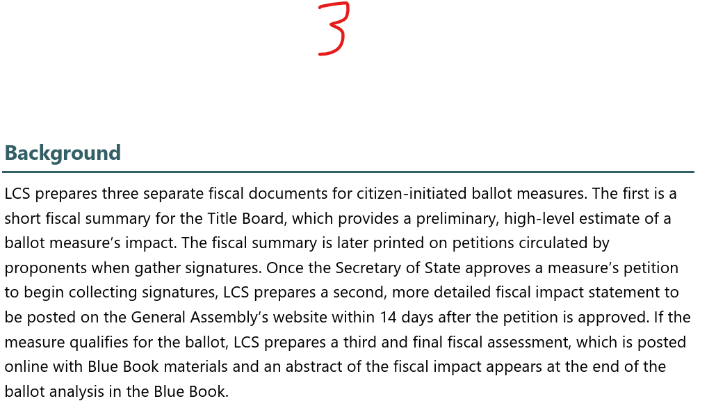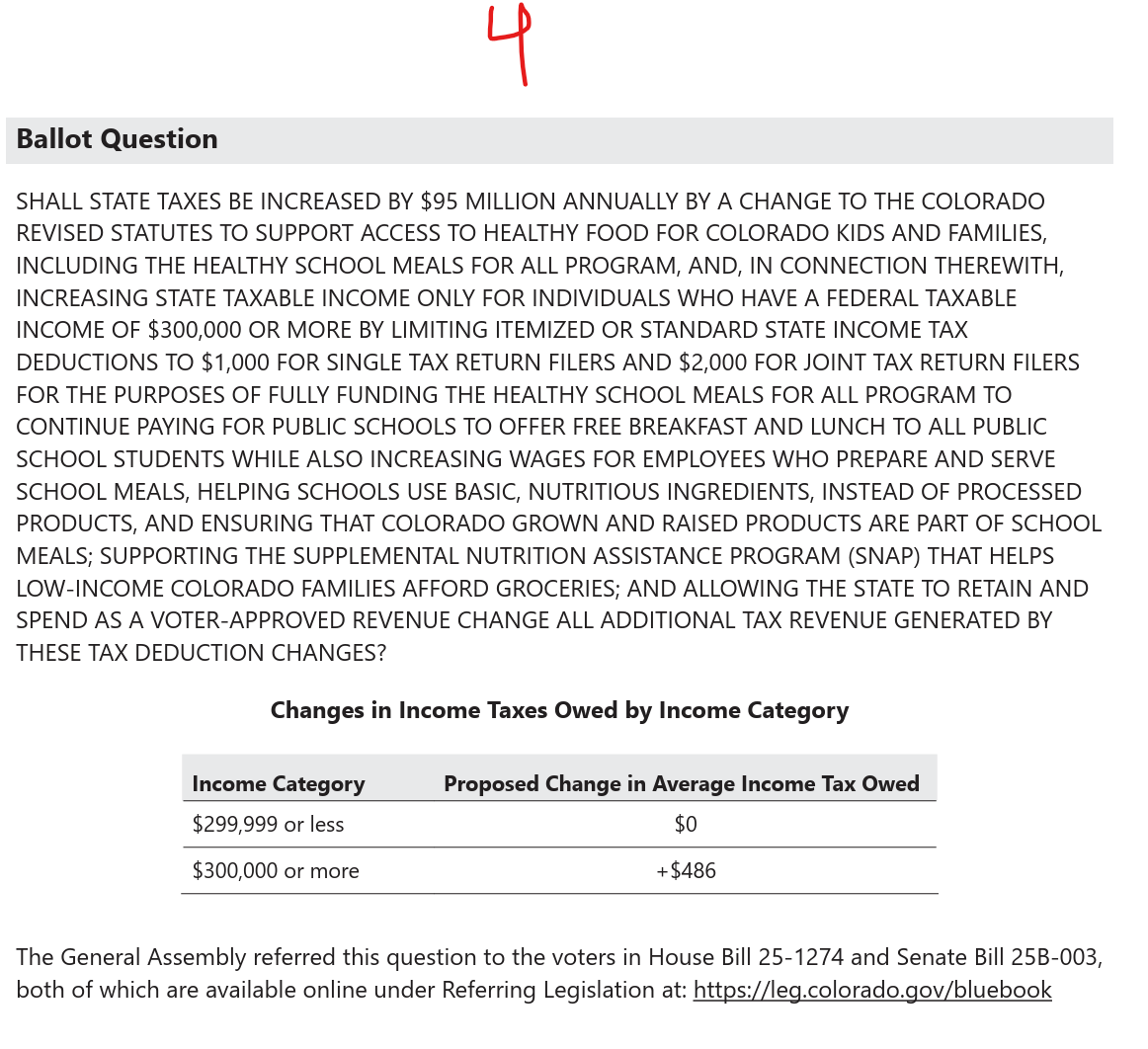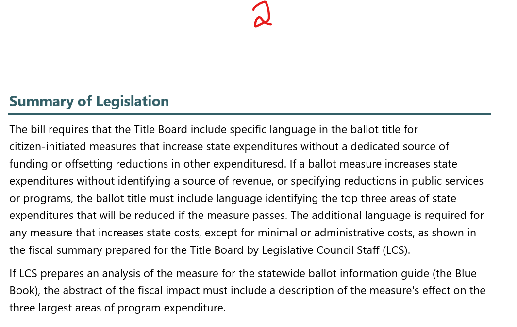 For the current bill, HB26-1084, it’s not quite a scare tactic, but you do have to talk about cuts. Quoting the fiscal note: “...specifying reductions in public services or programs, the ballot title must include language identifying the top three areas of state expenditures that will be reduced if the measure passes.”