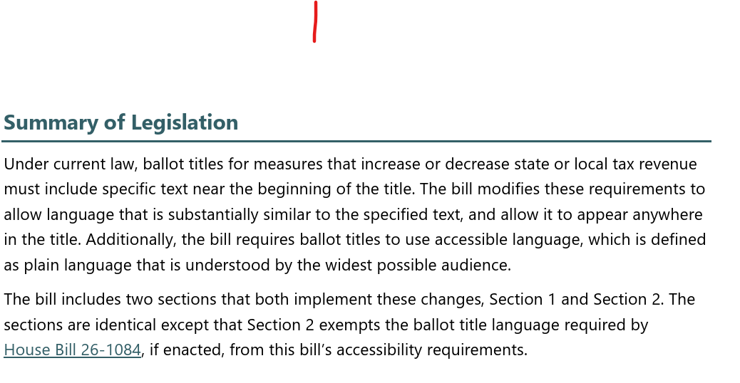 HB26-1320 spends quite a bit of time on “plain language” which is defined in the bill. I don’t know that I see a problem there. The changes that are of note in this bill are that the language can be moved around at will by the Title Board (the unelected triumvirate that decides on ballot titles).