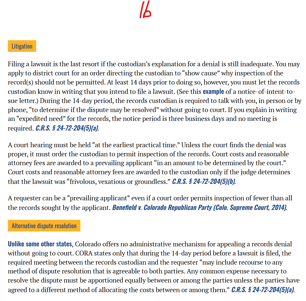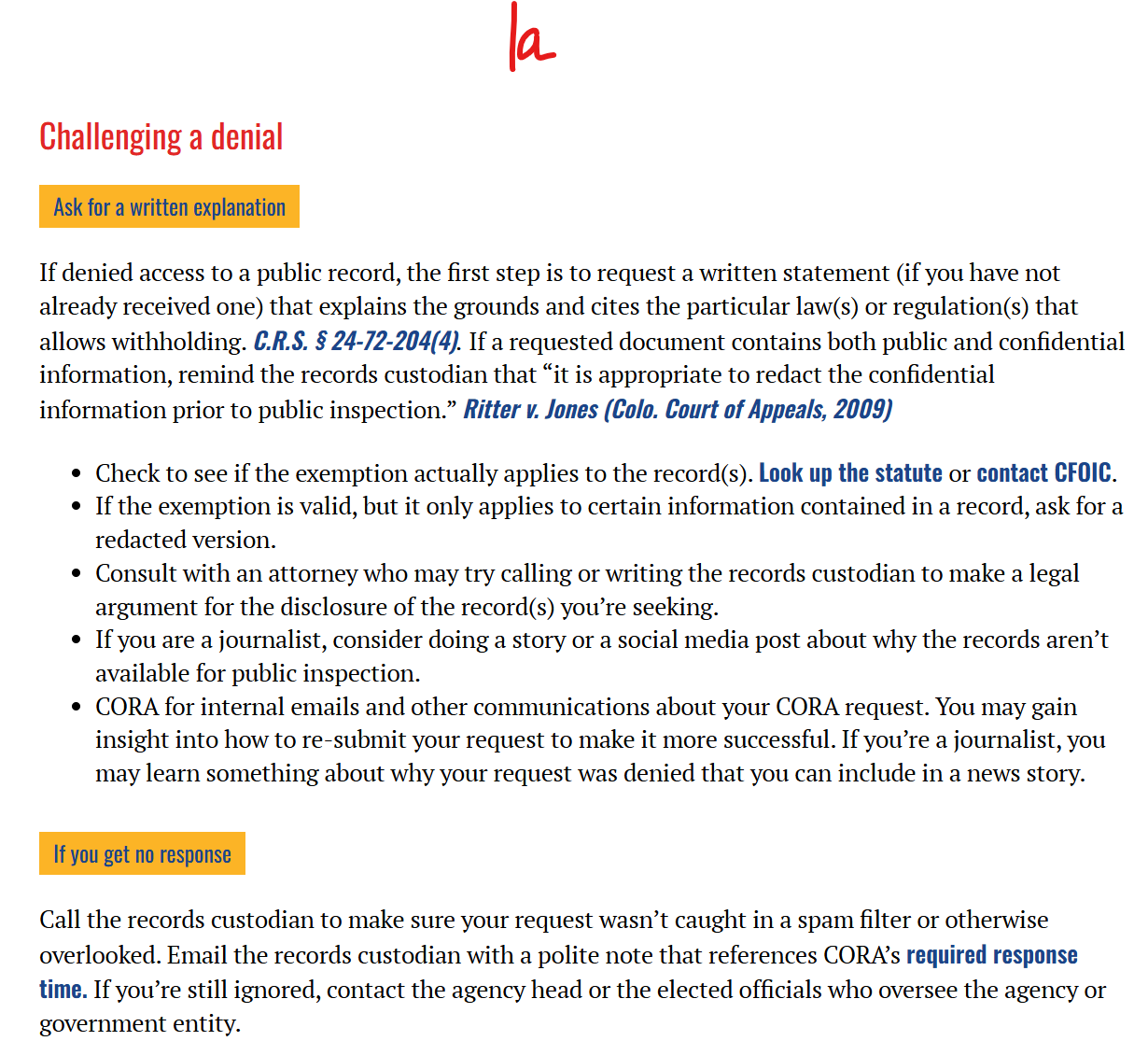 I turned, as I often have,** to the Colorado Freedom of Information Coalition's helpful guide to CORA requests. It is linked second below. I took screenshots of the relevant portions relating to what to do if your request is denied and attached them as 1a and 1b.