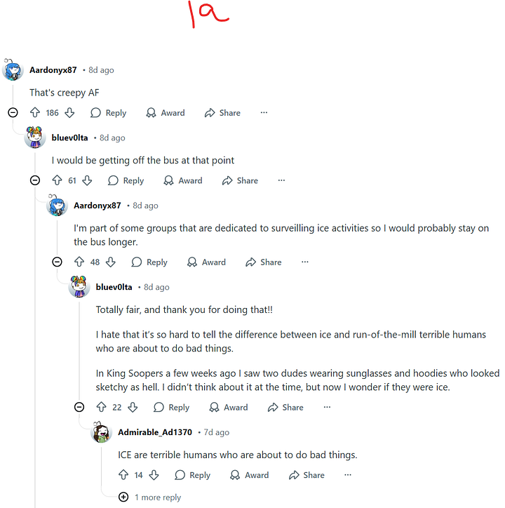 A quite unsubtle anti-ICE (anti immigration enforcement?) sentiment exists broadly among some Americans. I won't go into the more extreme rhetoric like you've seen from politicians, but screenshots 1a and 1b attached (both found in or through the Colorado Sun) illustrate how this sentiment manifests among ordinary people.